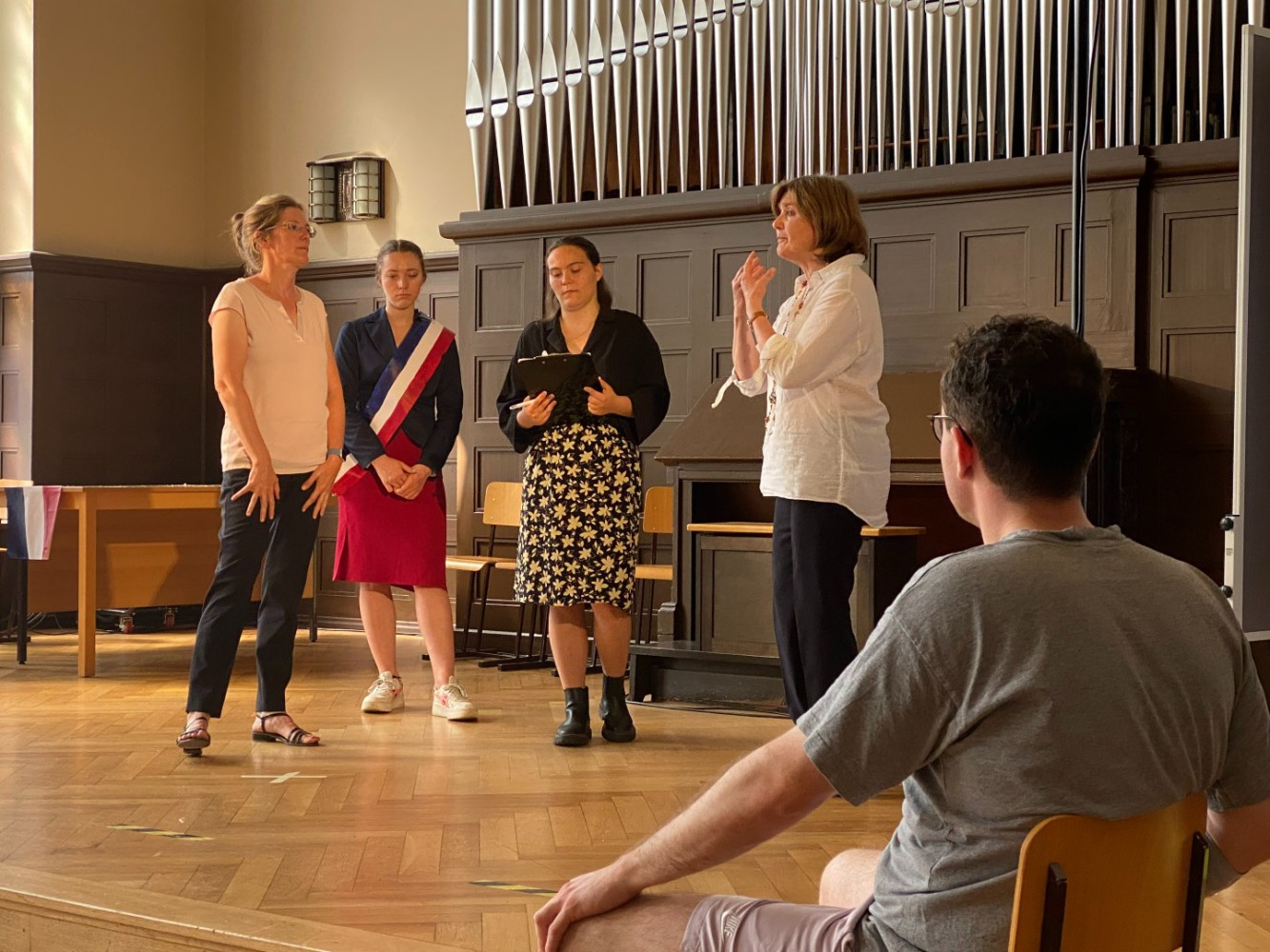 Am Donnerstag, dem 22.06.2023, bekamen die neunten und zehnten Klassen des Käthe-Kollwitz-Gymnasiums die einmalige Möglichkeit, an einem Theaterstück, das von der Deutsch-Französischen Hochschule gefördert wurde, mit dem Namen „Fragments franco-allemands - kleine Geschichten, die Geschichten schreiben“ teilzunehmen.